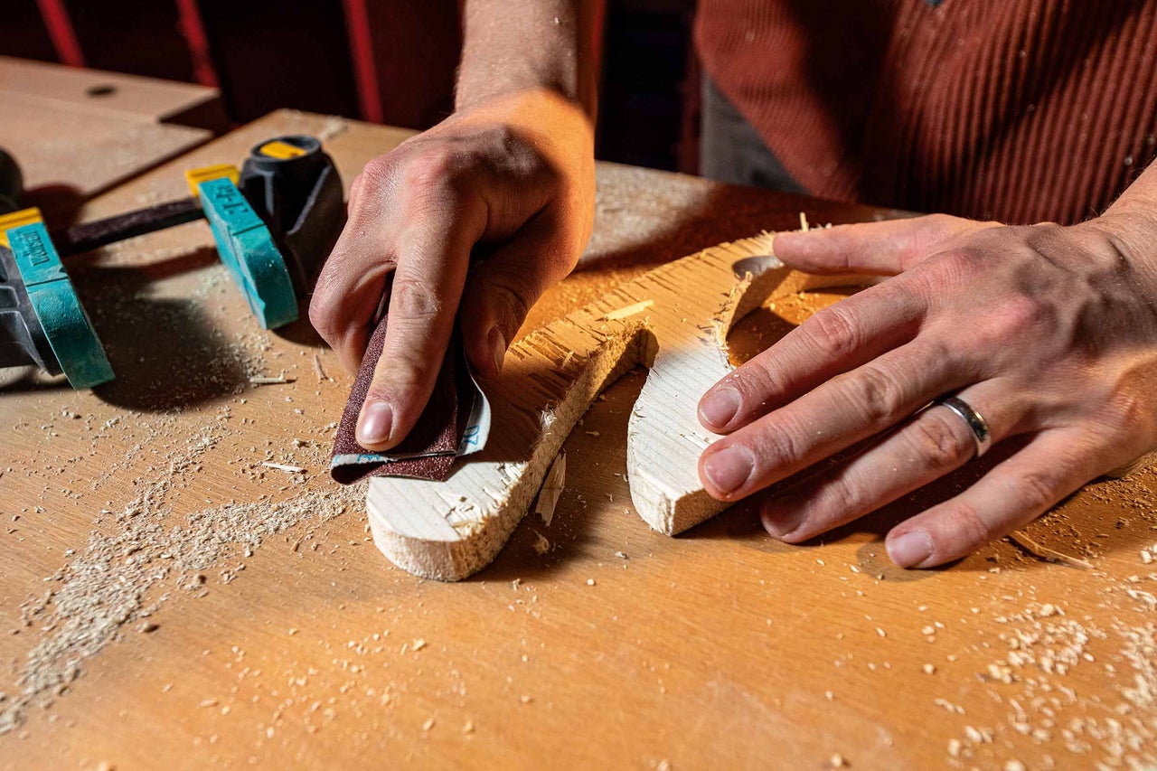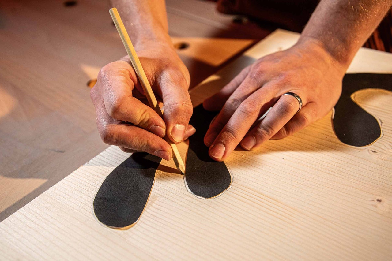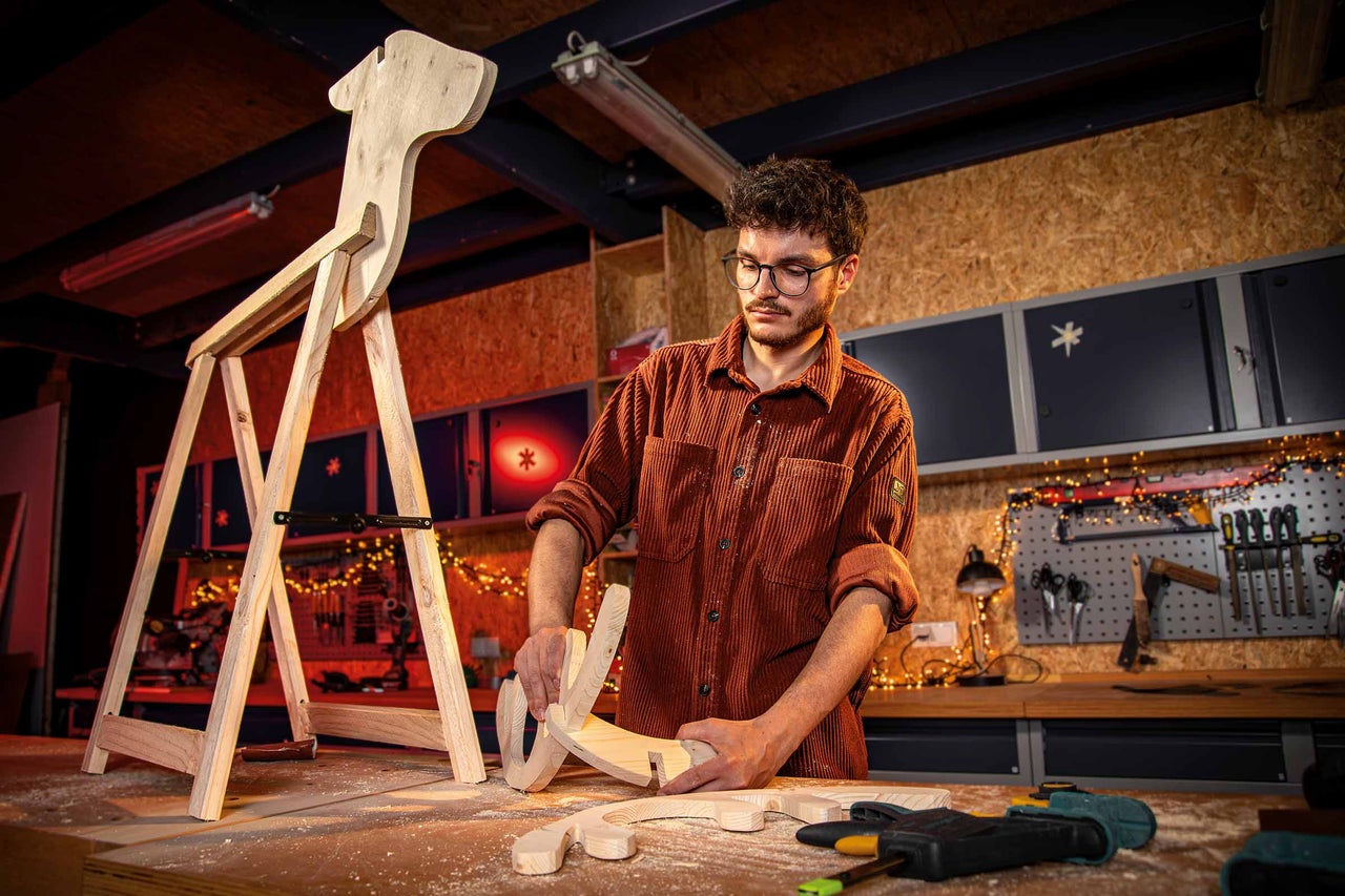 Sätt ihop de utsågade delarna enligt mallen, placera dem på träbocken och se till att huvudet står stabilt.