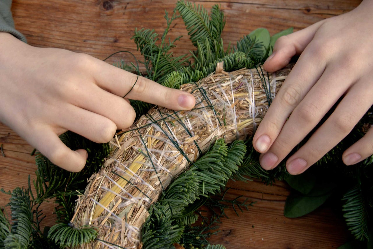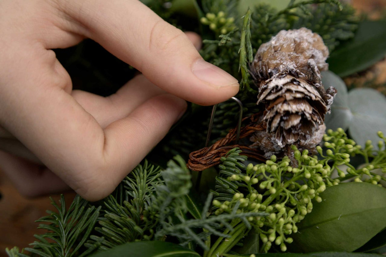 TIPS: Här kan du skapa en egen ögla att hänga upp kransen med.