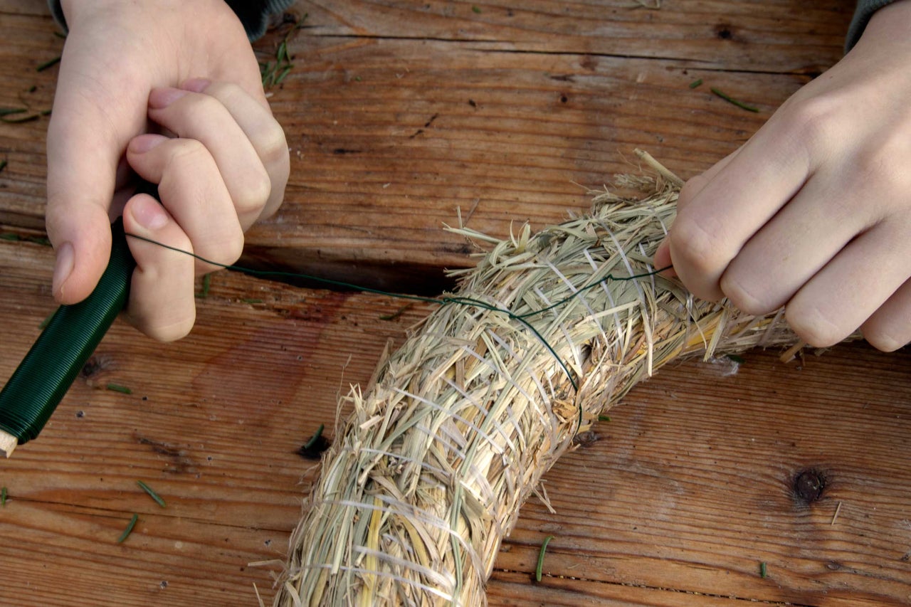 Jobba runt hela stommen, försök att se så att den blir jämntjock. Men, det går alltid att klippa bort något som blev för mycket eller fästa lite extra om man missar någonstans. Tänk på att täcka både in och utsida av halmstommen. Du behöver inte täcka baksidan om du inte ska se den från två håll. Till exempel en dörr med glasruta.