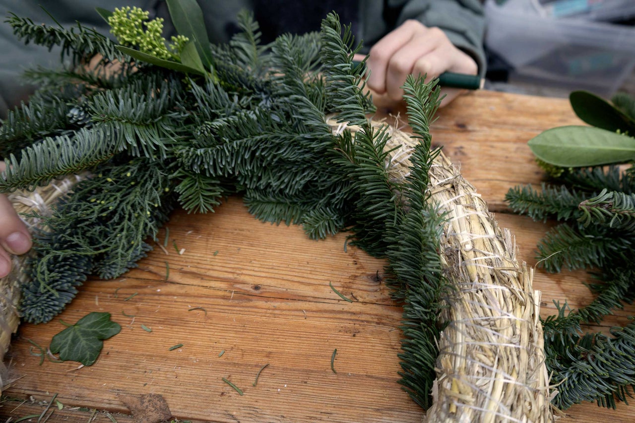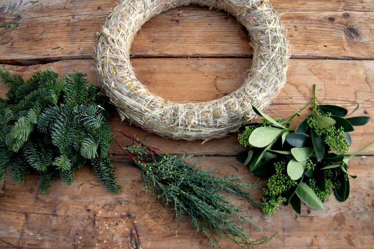 Välj vilka vintergröna växter du vill använda. I denna krans har vi använt en blandning av