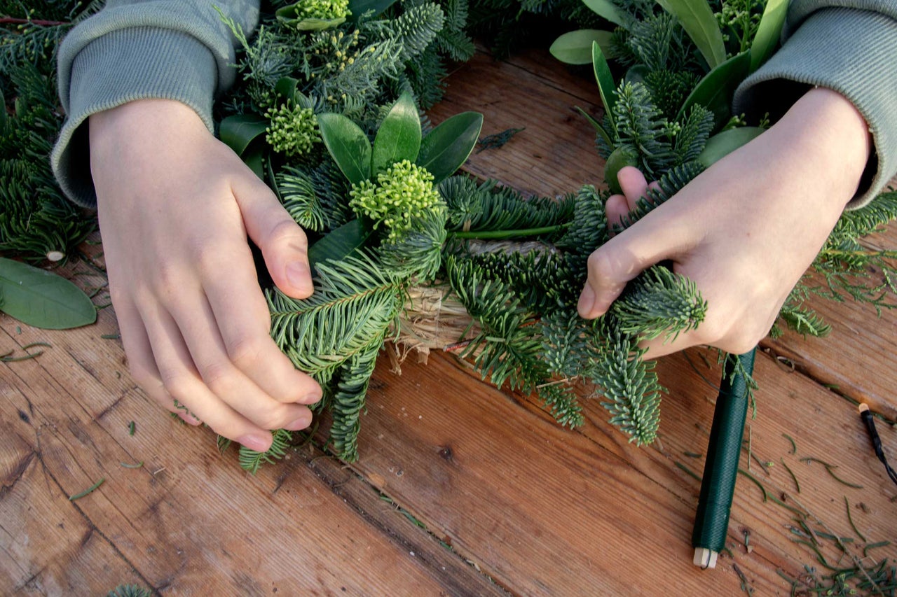 TIPS: Använd växter med olika struktur och form, då får du en livfullare krans. Det är även bra att klippa till allt material i mindre bitar innan du börjar binda. På så vis går det enklare när du är igång och resultatet blir ofta jämnare.