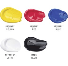 - Set bestående av5 x 118 ml grundläggande akryl − primärröd, primärblå, primärgul, elfenbenssvart, titanvit