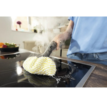 Kärcher SC 3 EasyFix är tidernas snabbaste ångtvätt! SC 3 EasyFix är klar att användas efter en uppvärmningstid på bara 30 sekunder. Den snabbt och kontinuerligt påfyllningsbara vattentanken spar tid genom att möjliggöra rengöring utan avbrott. Avkalkningspatronen avkalkar vattnet automatiskt och förlänger därmed maskinens livslängd. Kärcher SC 3 är en mångsidig ångtvätt som rengör utan kemikalier. Rengör alla typer av hårda ytor och tar bort 99,99 % av hushållsbakterierna. Mångsidiga tillbehör håller kakel, spishällar, spiskåpor samt små springor och fogar skinande rena. Avlägsnar även hårt sittande smuts. Med flexibel koppling för perfekta rengöringsresultat. Ångintensiteten kan anpassas till ytan och smutsen med ett tvåstegs ångreglage. Andra funktioner: tillbehörsförvaring och parkeringsläge för golvmunstycket. Tack vare lamellerna på undersidan av golvmunstycket EasyFix stannar ångan länge på golvet för perfekta rengöringsresultat. Det platta utförandet och munstyckets flexibla led gör att golvmunstycket EasyFix enkelt kommer in under möbler. Golvduken byts utan kontakt med smutsen genom att trampa på golvdukens fotflik och dra golvmunstycket EasyFix uppåt.