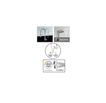 - Egenskaper: Manöverspak i metall, Keramisk patron, Vridbart utlopp, Engreppsblandare, Snabbmontering underifrån "Quickfix"