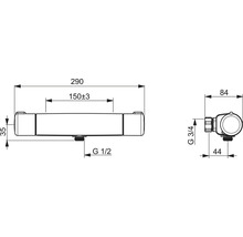 Termostatblandare för dusch. Temperaturvred med säkerhetsspärr vid 38°C, volymvred med kontroll för Ecoflöde, keramisk överdel. Blandaren är utrustad med backventiler och smutsfilter.