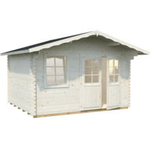 Friggebod i trä PALMAKO Emma 10,4 m² i obehandlade 34-mm-limträstockar med vindtäta dubbelhaksknutar och ett 70 cm djupt taköverhäng Enkelfönstret är vrid-/sidohängt, den stabila, halvt inglasade dubbeldörren med karmar i limmat trä och cylinderlås har en låg tröskel belagd med rostfri plåt. Fönster och dörr med 4 mm enkelglas och löstagbar spröjs. I byggsatsen ingår även impregnerade grundbjälkar, spontade 19-mm-golvbrädor, förankringsstänger och en monteringssats. Mot en extra kostnad levererar vi Emma med en färglös, brun eller grå doppimpregnering som underlättar vidarebehandling. Som tillval finns takpapp, takspån och takavvattning. Det går också att komplettera Emma med ett skyddstak, en bod och extra dörrar och fönster.