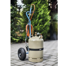 Det spelar ingen roll var: CFH gasvagn GT89 hjälper dig att att transportera tunga 5 och 11 kg propangasflaskor på ett smart sätt. Gasvagnen GT89 är liten, men presterar väl. De vanliga 5 och 11 kg propangasflaskorna sätts säkert och stabilt fast på gasvagnen GT89 och kan enkelt flyttas dit de behövs. • justerbar säkerhetslåsning för propangasflaskan • säkerhetskedja för propangasflaska • vingmutter för fastsättning av säkerhetskedjan • två luftfyllda gummidäck • två slangkrokar för platssparande upprullning av gasslangarna • en praktisk hållare med extra säkerhetskrokar för gasbrännare Leveransomfattning • 1x gasvagn GT 89 • 1x monteringsanvisning Tekniska specifikationer: • mått (h x b x d): ca 1000 x 460 x 260 mm • förpackningsmått (h x b x d): ca 560 x 280 x 130 mm • vikt: ca 4,5 kg • användning: för 5 och 11 kg propangasflaskor • maxbelastning: ca. 30 kg • material: stål pulverbelagd • lasthöjd: 600 mm