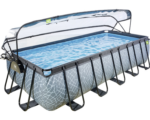 EXIT Stone Pool ø400x200x122 cm är en rektangulär gråfärgad pool med ram och pooltak. Den här poolen levereras som standard med en sandfilterpump, värmepump och en poolstege så att du kan ta dig i och ur poolen på ett tryggt sätt.