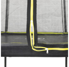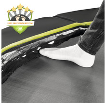 Den här EXIT Silhouette-studsmattan är attraktiv i sin matt svarta färg med färgaccenter i grönt. Det ger studsmattan ett modernt och elegant utseende. Skyddsnätet med vackert böjda stolpar och det hårt spända nätet understryker detta. Studsmatta och nät utstrålar transparens och ger extra säkerhet eftersom barnen inte kan fastna i nätet. Stolparna har ett snyggt skyddsöverdrag i högkvalitativt skummaterial som minskar risken för smärtsamma beröringar till ett minimum. Kantskyddet har på hela sin bredd på 28,5 cm en tjocklek på 20 mm och täcker fjädrarna helt. Dessutom skyddas mellanrummet mellan kantskyddet och fjädrarna av ett nät så att barnen inte av misstag hamnar med foten mellan fjädrarna. Tillträdet till studsmattan säkras med en robust dragkedja i fluorescerande grön färg. Om man hoppar fel så faller man alltså under inga omständigheter utanför själva hoppduken.