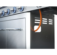 - ArtikelfördelVikbart varmhållningsgaller, LED-kontrollruta - belyst kontrollruta, brännare i rostfritt stål, sidobrännare med höjdjusterbart grillgaller, termometer på locket för temperaturkontroll, förvaring för grillgaller och insatser, låsbara hjul för säker placering, tryckreducerare med slangbrottsskydd