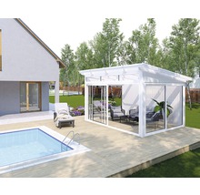 Byggsats med limträstomme, tak och skjutpartier anpassat för fristående montering. Träpanel/panelvägg ingår ej i byggsatsen.