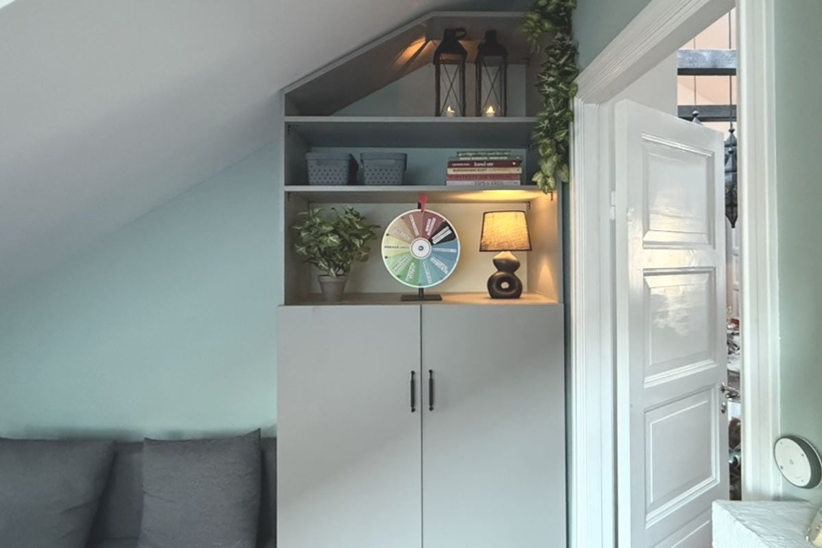 Jag vet vad du tänker! Vi hade kunnat köpa en Billy och varit klara på en eftermiddag. Men nej, inte vi. Vi bestämde oss för att bygga en egen hylla – för hand, med sågspån i håret, och diskussioner om vem som egentligen har mest (vinkel)rätt. Anders fick mäta och skruva. Jag målade, kommenterade, åt godis, hejade på och stylade. Resultatet? En hylla som faktiskt passade vårt snedtak, rymmer både gitarrer och poddprylar."