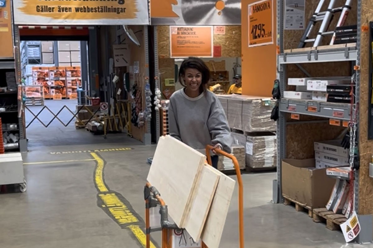 Sedan drog vi till HORNBACH, där jag helt själv bad om hjälp i sågservicen (ett av mina bästa byggknep faktiskt – låt proffsen kapa brädorna åt dig). Vi fick också massor av tips om verktyg, och på färgavdelningen hittade jag min nya kärlek: Snickerifärg i kulören Slab från Nordsjö – en av 20 unika nyanser framtagna exklusivt för HORNBACH. En perfekt grågrön ton som smälter in i rummet och samtidigt känns lite lyxig.