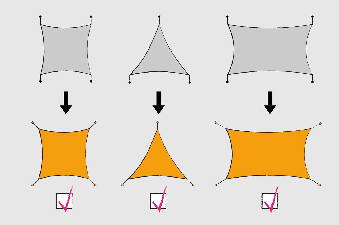 Ett korrekt spänt solsegel ska inte fladdra i vinden eller hänga slappt. Se även till att det lutar något, så att regnvatten kan rinna av – särskilt viktigt om du har valt ett vattentätt solsegel.