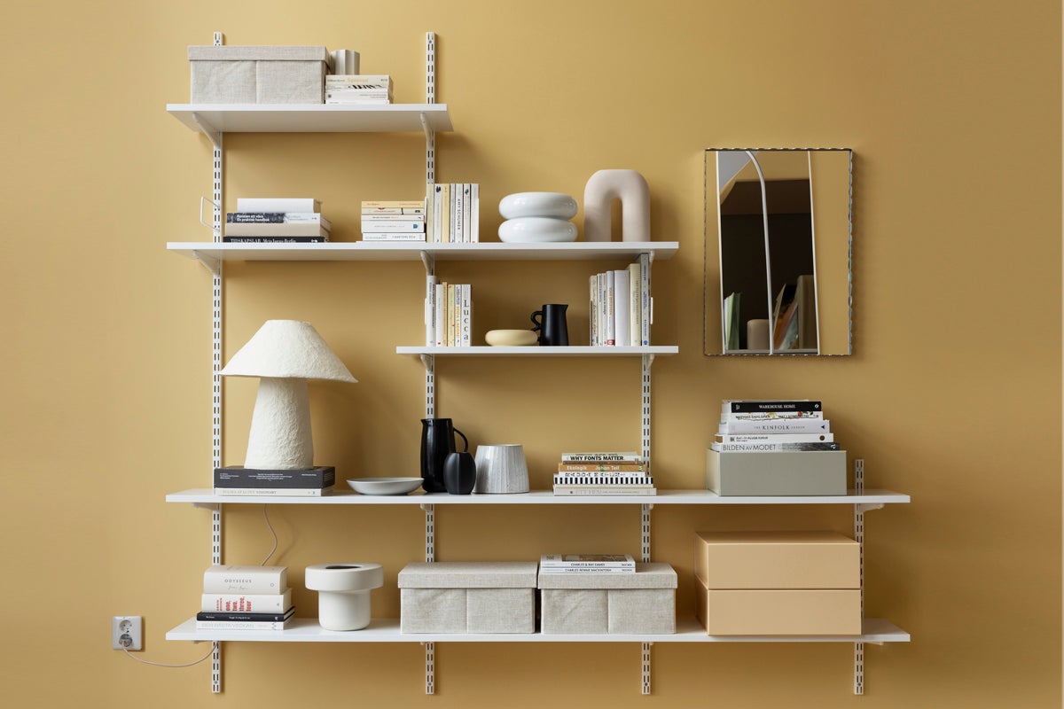 Elfas klassiska väggmonterade "Sparring"-system. Systemet består av skenor som fästs direkt i väggen, konsoler för hyllplan och traditionella melaminhyllplan. Hyllsystemet kan användas för måttanpassade lösningar i "svåra" utrymmen, såsom runt dörrar eller under en trappa.